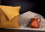 Kit 1 Dorado: Tapete Gris con puntos color mostaza, 2 Cubiertas de Cojín Cuadrado color Mostaza, Una Jarra de barro rojo de Tlapazola