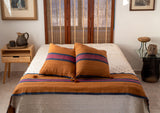 Juego de pie de cama con cubiertas para cojín cuadrado hechos a mano con tintes naturales. Desde arriba en la Sierra Mixe de Oaxaca el maestro Proceso elabora estas piezas únicas tejidas en telar de pedal y previamente se realizan el teñido a base de  tintes naturales de 4 colores básicos como añil, corteza de palo de águila, grana cochinilla y flor de cempasúchil.